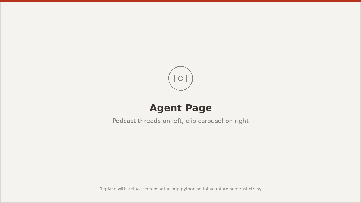 Getting the agent running takes three steps: subscribe to podcasts, navigate to the Agent page, and the clips arrive automatically. Subscribe to any podcast from the podcast search page, then go to the Agent section where your subscribed shows appear as threads. When new episodes publish, Unspool Studio detects them instantly and starts processing—no toggles, no configuration needed.